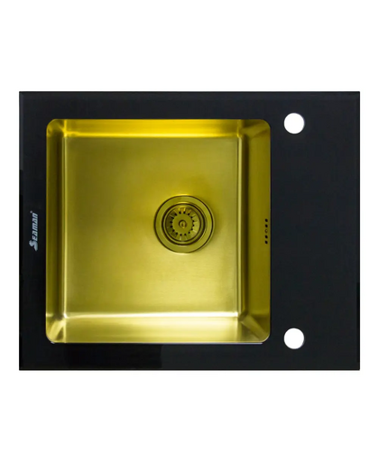SMG-610 Black Gold (черная панель, золотая чаша PVD) - комбинированная мойка для кухни с черной стеклокерамической панелью и с золотой чашей из нержавеющей стали (AISI-304) с PVD-покрытием. Монтаж врезной (PanelTop). Одная чаша. Вентиль-автомат. Выпуск в цвет чаши мойки. Оборачиваемая модель. Чаша: 400x400 мм. Глубина: 200 мм. В базу: от 60 см. Чаша - глубокая вытяжка из стали 1,0 мм. R20. Полная комплектация. Индивидуальная упаковка.